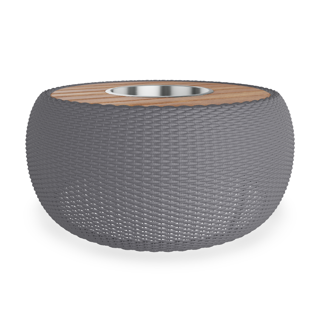 Mesa com estrutura em alumínio com acabamento em pintura eletrostática, corda Náutica, com aditivos anti-Uv que evita o ressecamento e a descoloração. Tampo ripado em madeira maciça de cumaru e champanheira de Inox.
