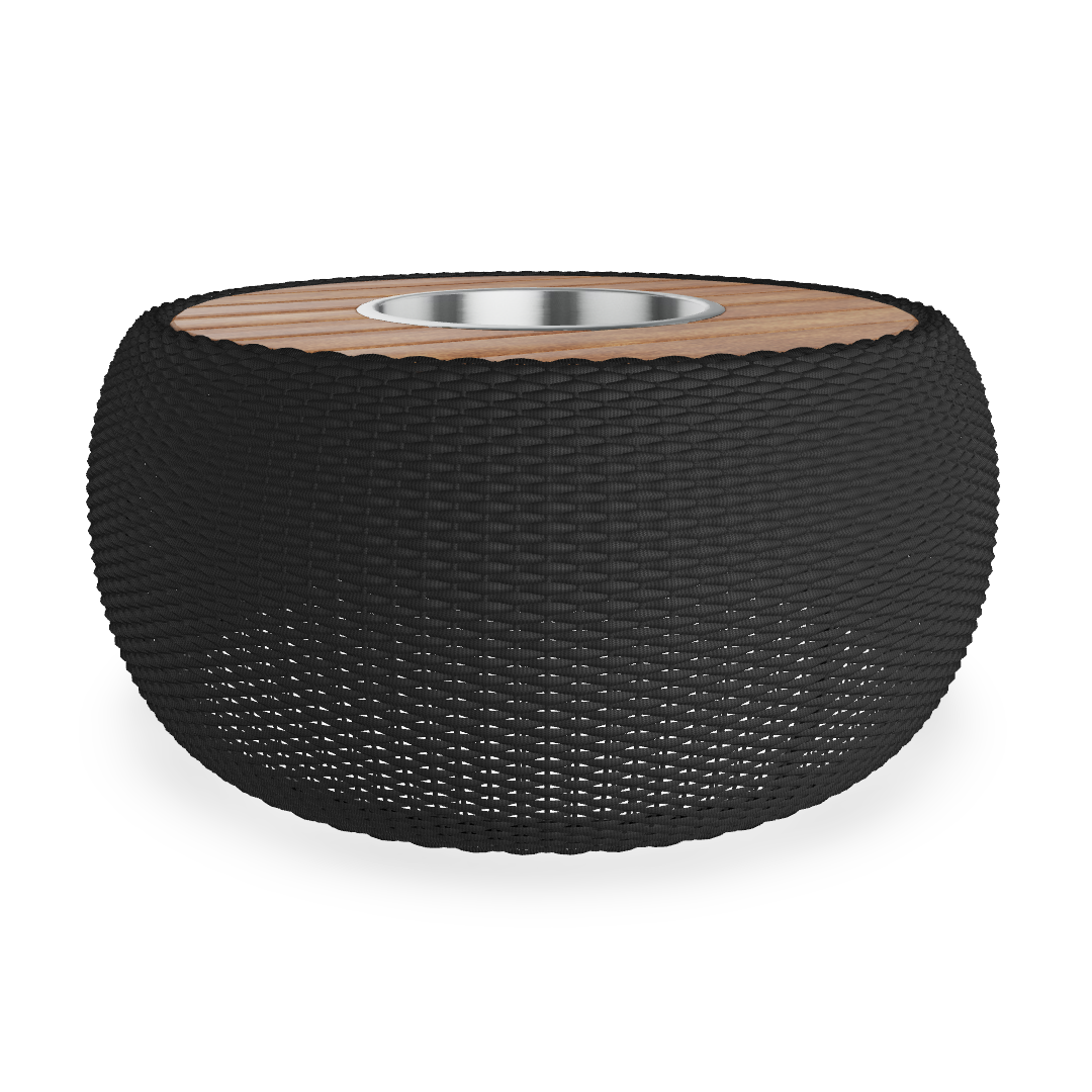 Mesa com estrutura em alumínio com acabamento em pintura eletrostática, corda Náutica, com aditivos anti-Uv que evita o ressecamento e a descoloração. Tampo ripado em madeira maciça de cumaru e champanheira de Inox.
