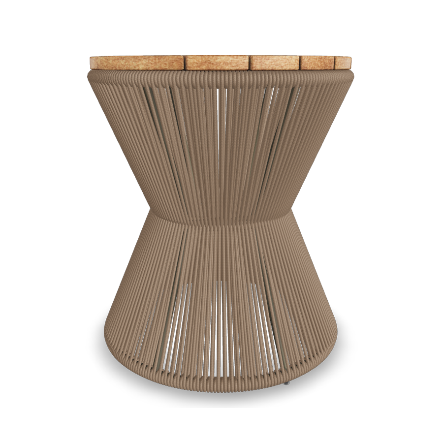 Mesa com estrutura em alumínio com acabamento em pintura eletrostática, corda Náutica, com aditivos anti-Uv que evita o ressecamento e a descoloração. Tampo ripado em madeira maciça de cumaru.