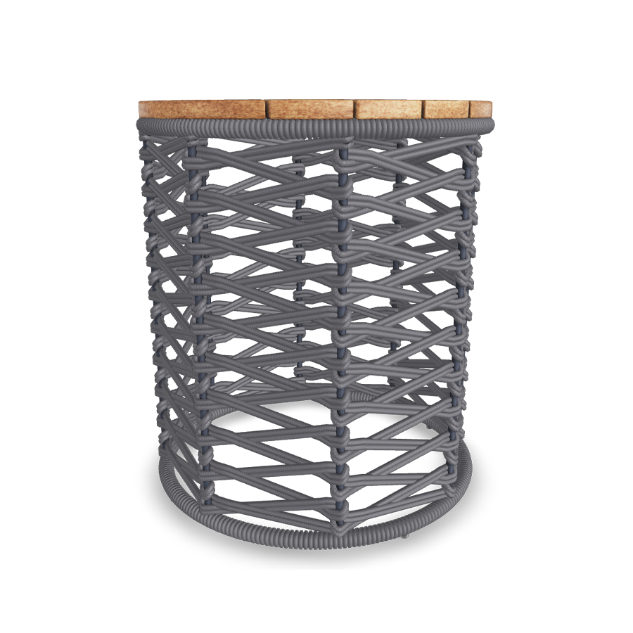 Mesa com estrutura em alumínio com acabamento em pintura eletrostática, corda Náutica, com aditivos anti-Uv que evita o ressecamento e a descoloração. Tampo ripado em madeira maciça de cumaru.
