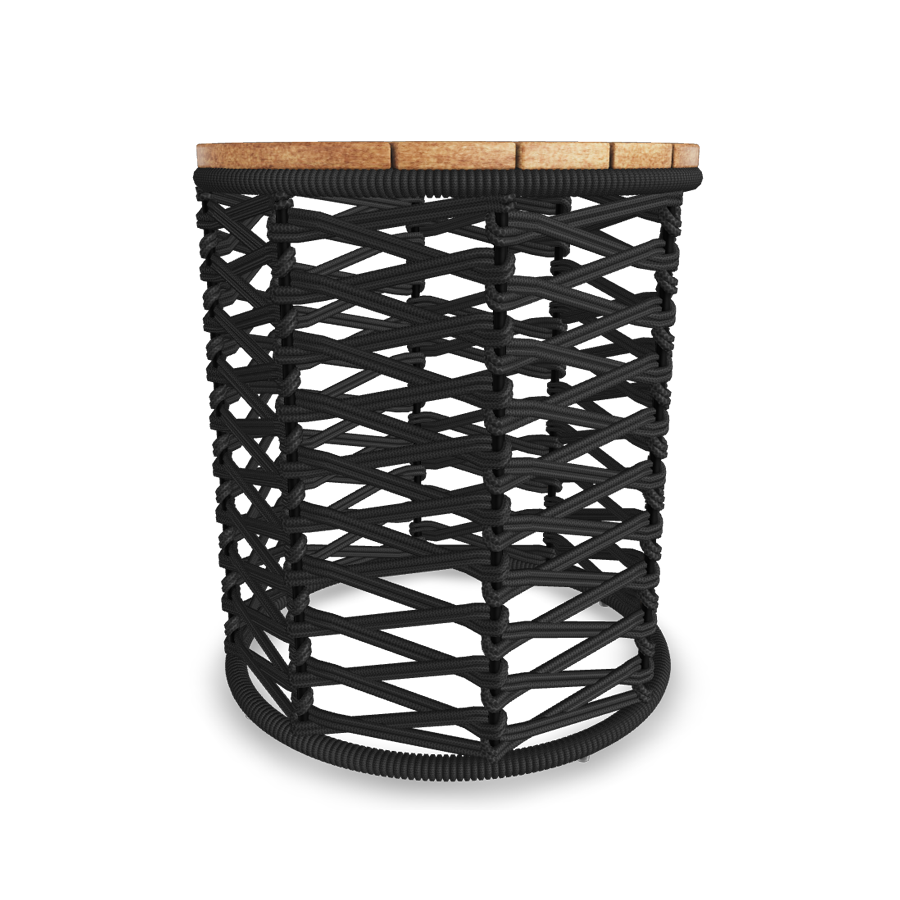 Mesa com estrutura em alumínio com acabamento em pintura eletrostática, corda Náutica, com aditivos anti-Uv que evita o ressecamento e a descoloração. Tampo ripado em madeira maciça de cumaru.