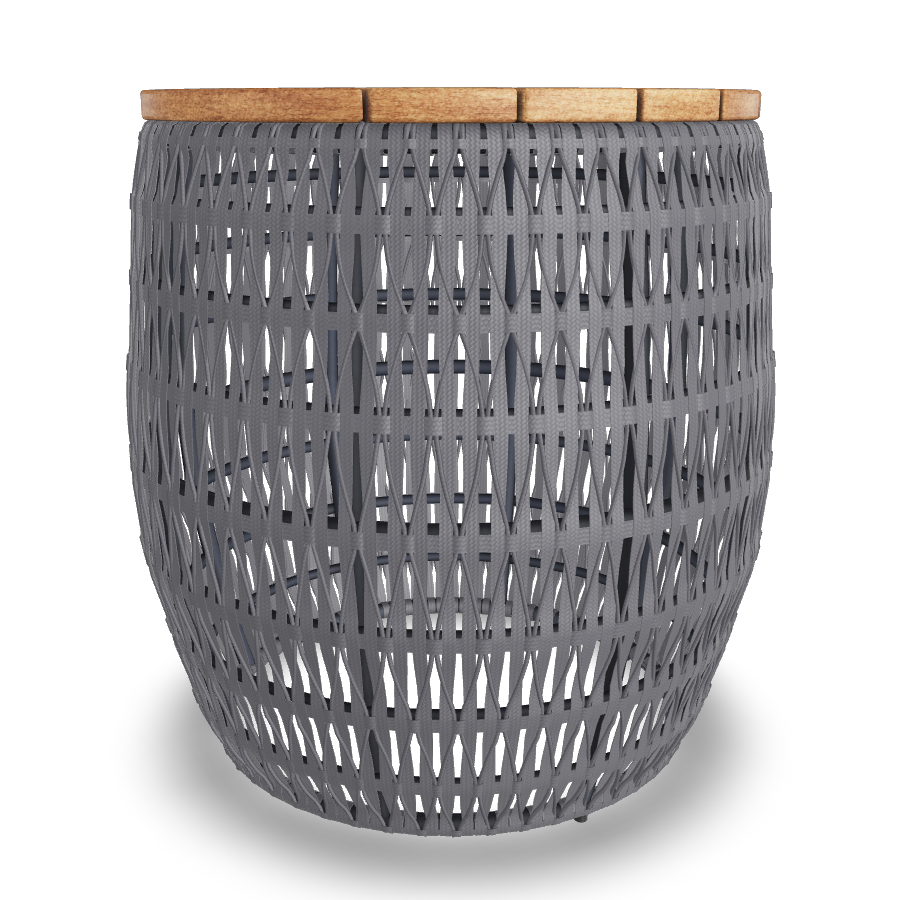 Mesa com estrutura em alumínio com acabamento em pintura eletrostática, corda Náutica e fibra sintética, com aditivos anti-Uv que evita o ressecamento e a descoloração. Tampo ripado em madeira maciça de cumaru.