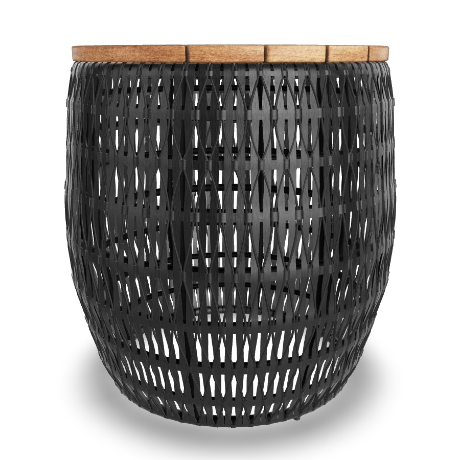 Mesa com estrutura em alumínio com acabamento em pintura eletrostática, corda Náutica e fibra sintética, com aditivos anti-Uv que evita o ressecamento e a descoloração. Tampo ripado em madeira maciça de cumaru.