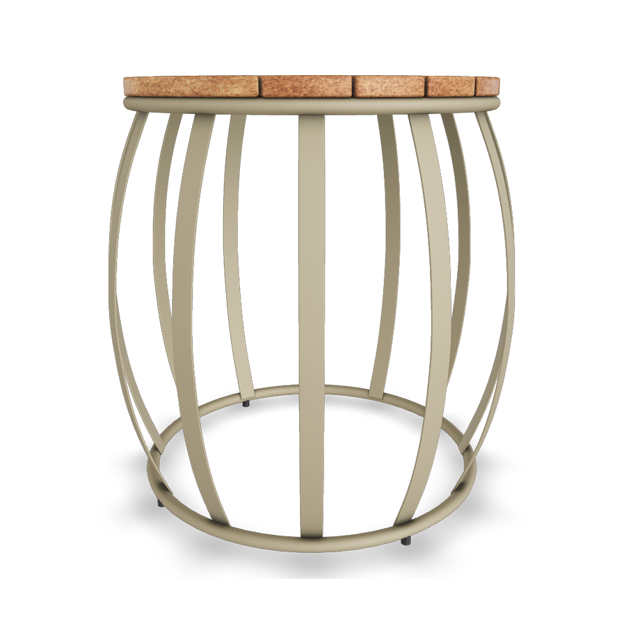 Mesa com estrutura em alumínio com acabamento em pintura eletrostática. Tampo ripado em madeira maciça de cumaru.